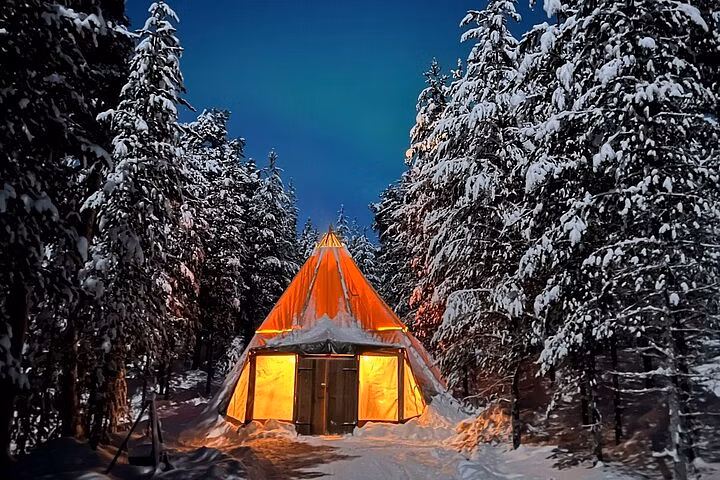 As evening falls, the adventure continues at Aurora Camp. Gather inside a warm Lappish kota tent, where your guides prepare dinner over an open fire. You can also choose to combine your evening with a tent sauna and ice swimming, a sleigh ride, or an aurora hunt on electric snow scooters. With a bit of luck, the Northern Lights will dance above as you enjoy the warmth of the fire and the peaceful silence of Lapland’s wilderness.