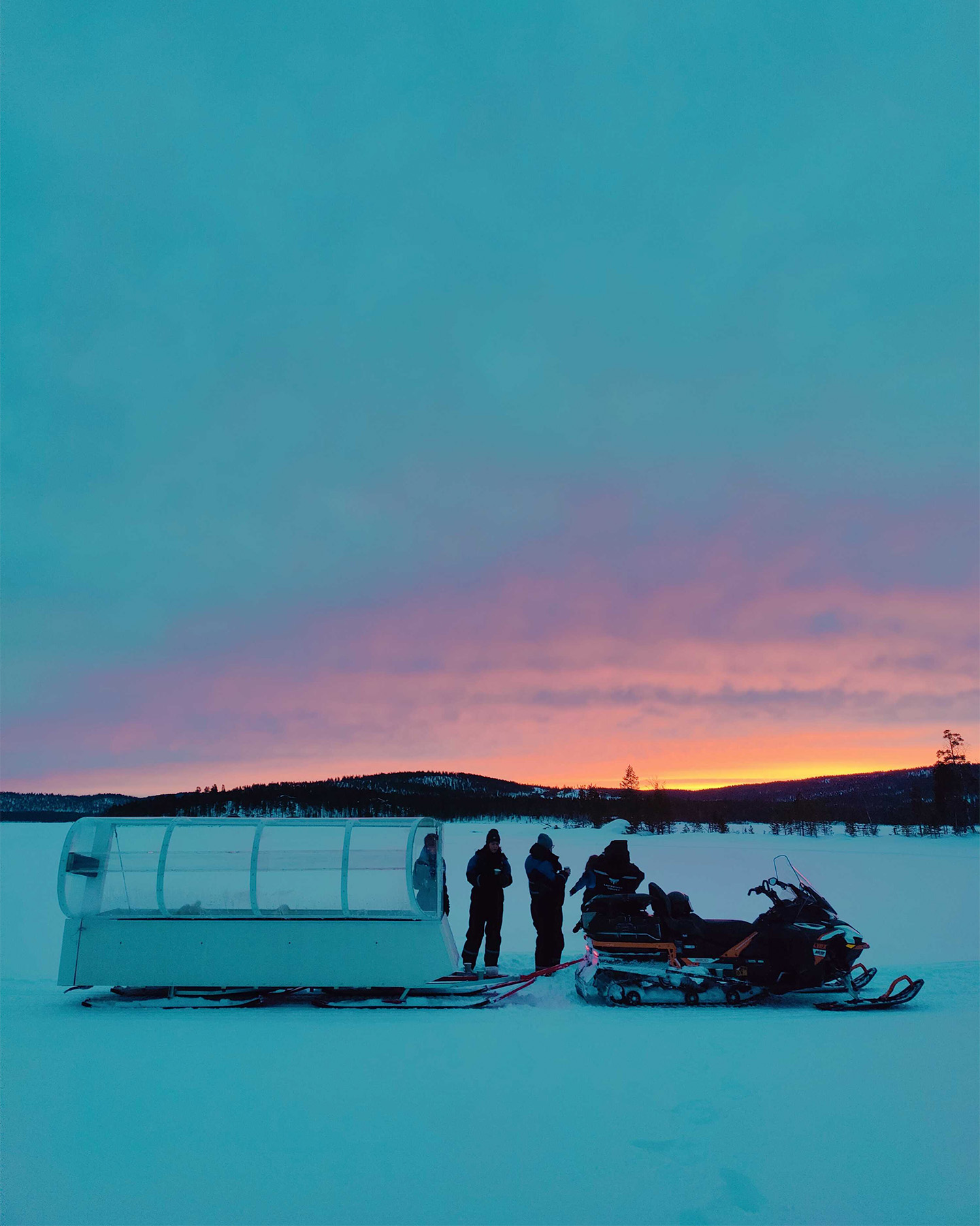 Take a seat in the heated Aurora sleigh and relax as your guide tows the sleigh with a snowmobile through the snow-covered forest and across the frozen lake. Enjoy the journey away from light pollution while staying warm and comfortable.